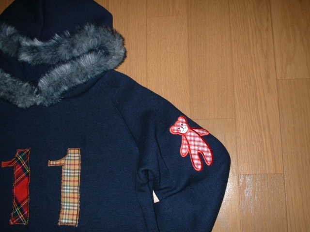 兄・妹の色違いパーカーにくまちゃんのワッペンを付けました。