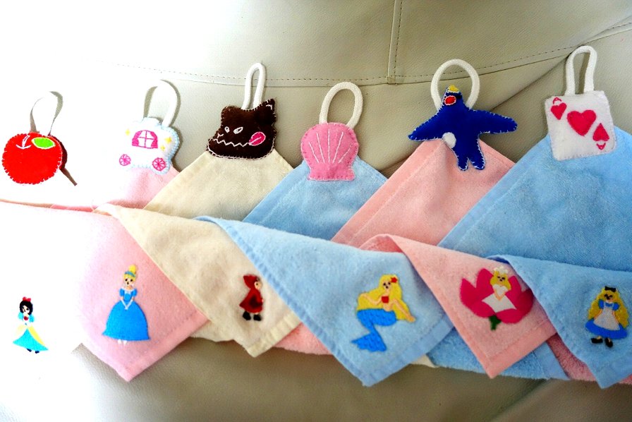 以前購入しました童話ワッペンで、入園グッズ、ループ付きタオルを作りました!